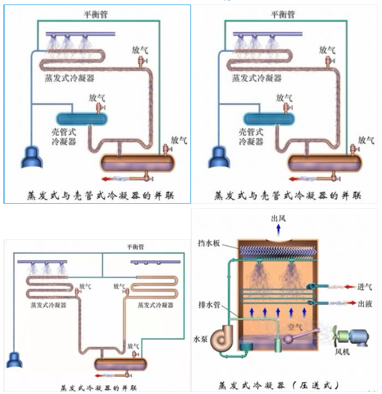蒸发式冷凝器的换热重要是靠冷却水正在氛围中蒸发汲取气化潜热而举办的。按氛围滚动式样可分为吸入式和压送式。