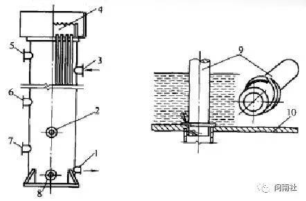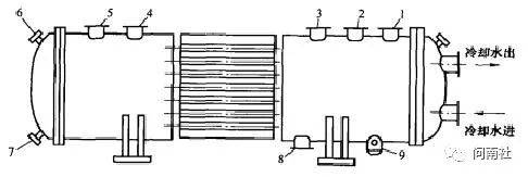 1一出液管接头2—压力外接头3—进气管接头4一配水箝5—安乐阀接头6—均压音接头7—放氛围管接头8—放油管接头9一导流管嘴10—管板